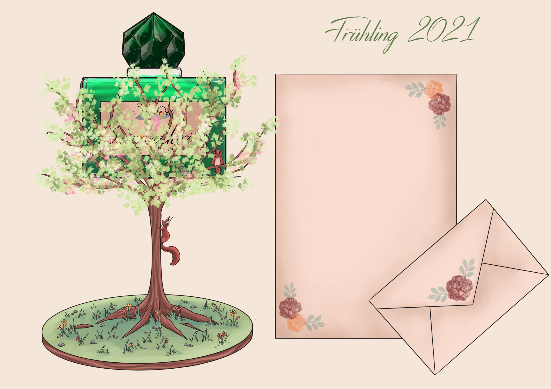 Ein Schmuckstück aus einem präsentierbarem Tintenhalter und einem Briefset. Ein Baum mit dünnen Ästen und frischen Blättern & Blüten hält ein Fässchen "Smaragdgrün" sicher in der Luft. Auf diesem Bäumchen lassen sich auch kleine Freunde erkennen! Die Hölzerne Bodenplatte wurde mit mehreren kleinen Frühlingsblumen und anderen Details geschmückt. Ein Meisterwerk der Schnitzkunst.